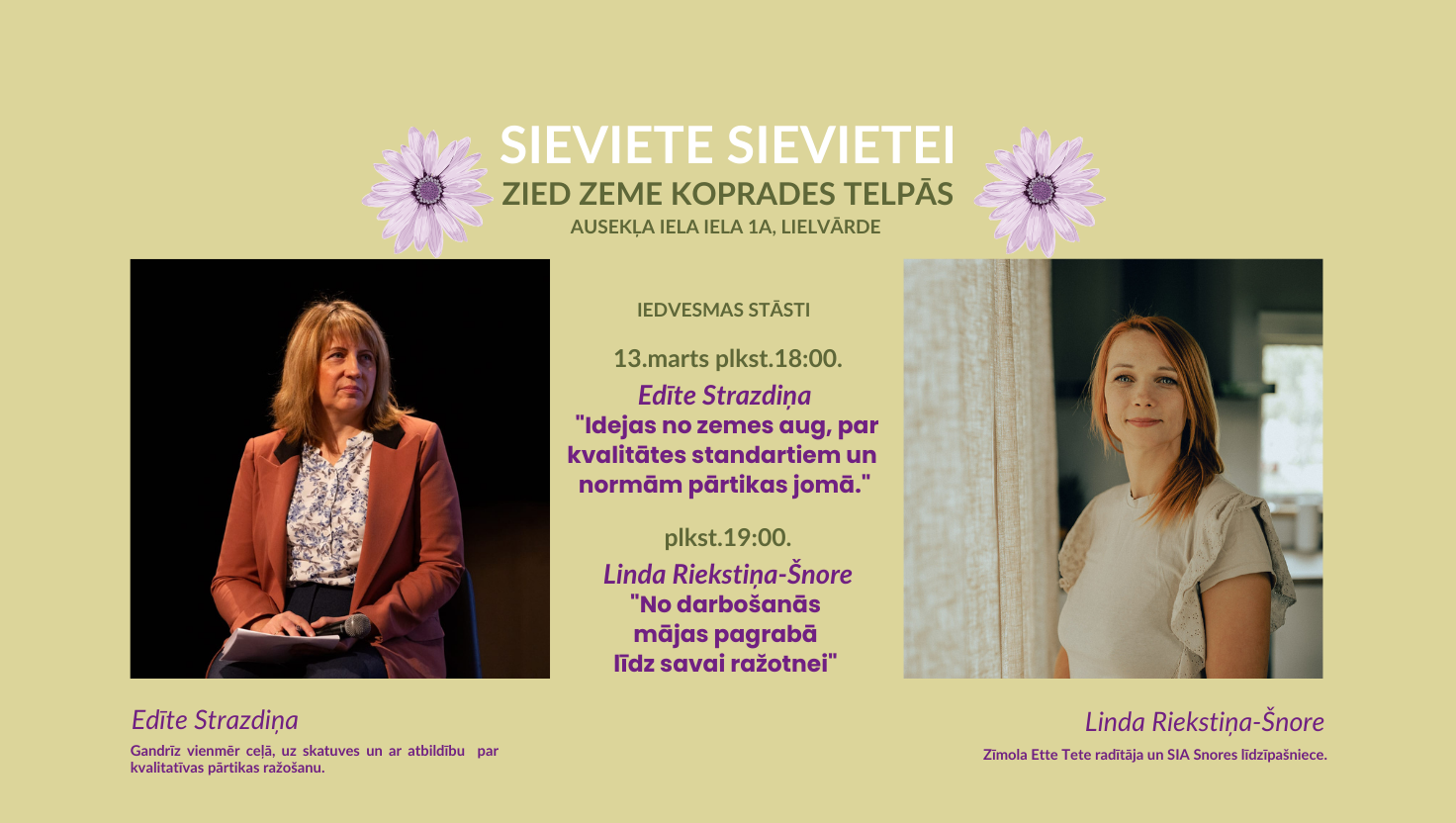 Edīte Strazdiņa ir veicinājusi vairāku uzņēmumu un sabiedrisku organizāciju tai skaitā Zied zeme "dzimšanu'. Viņai būs stāstu artava gan par izaicinajumiem savienot personisko dzīvi ar inerci vienmēr būt aktīvai, gan par starptautisko pieredzi, gan prakstiski padomi kvalitātes vadībā.