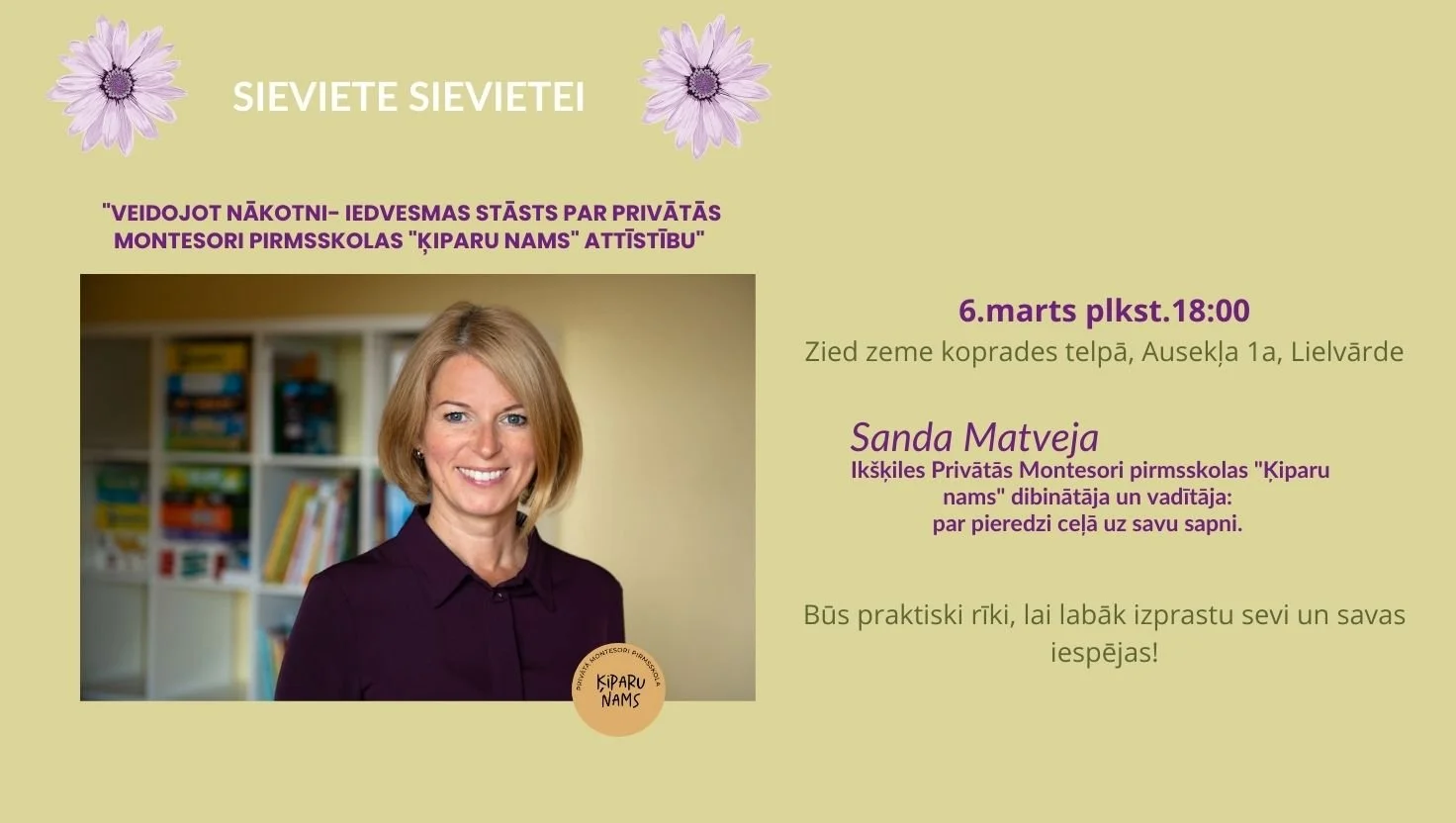 6. martā, patiesi saulainas un pavasarīgas dienas izskaņā, norisinājās pirmais stāstu vakars “Sieviete sievietei”, kurā privātās Montesori pirmsskolas “Ķiparu nams” dibinātāja Sanda Matveja dalījās ar savu pieredzi. Stāsts “Veidojot nākotni – iedvesmas stāsts par “Ķiparu nams” attīstību” aizrāva un iedvesmoja pasākuma dalībnieces.
