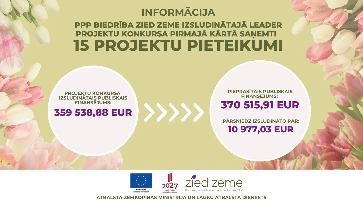 Saņemti 15 projekti, kuru pieprasītais publiskais finansējums ir 370 515,91 EUR, kas par 10 977,03 EUR pārsniedz izsludināto apjomu.